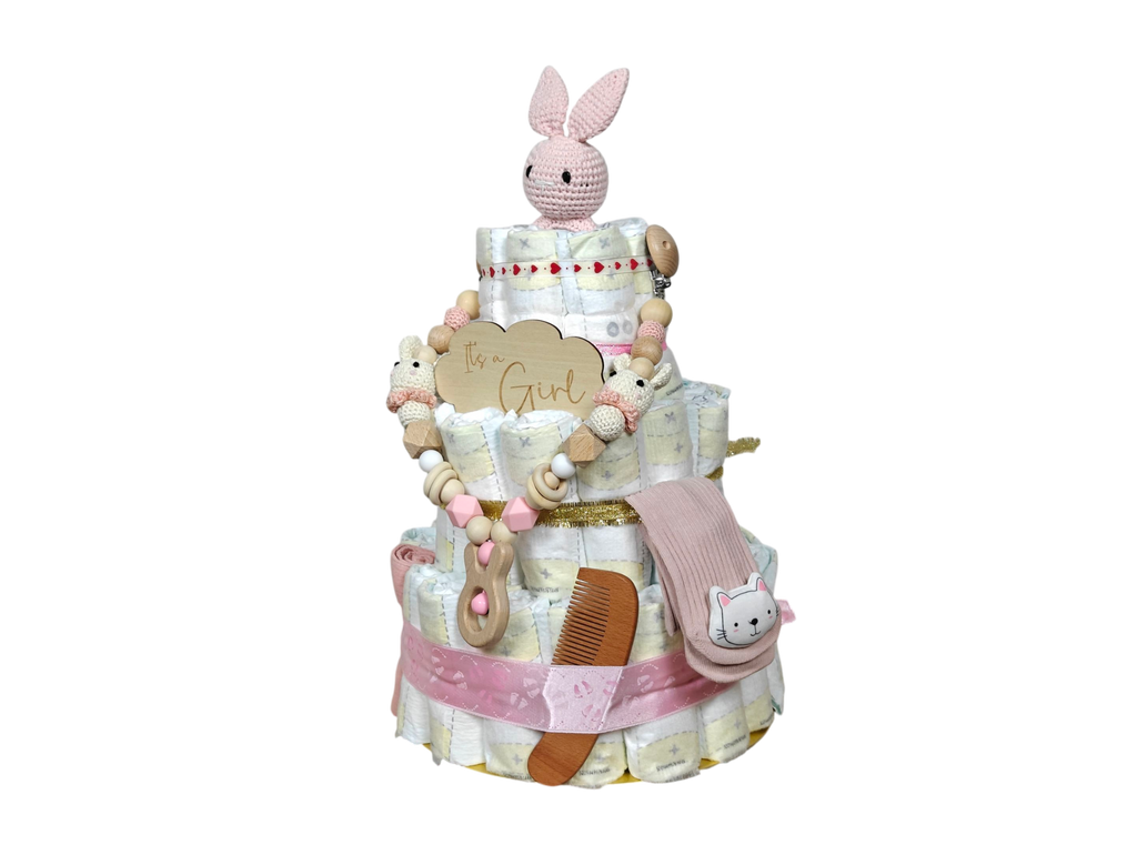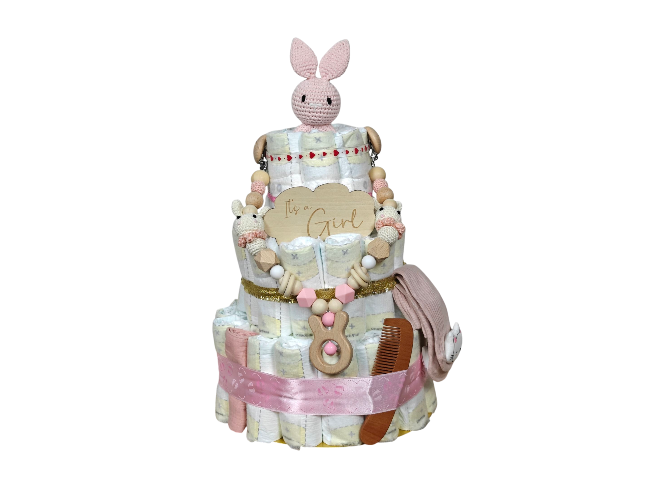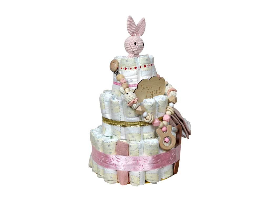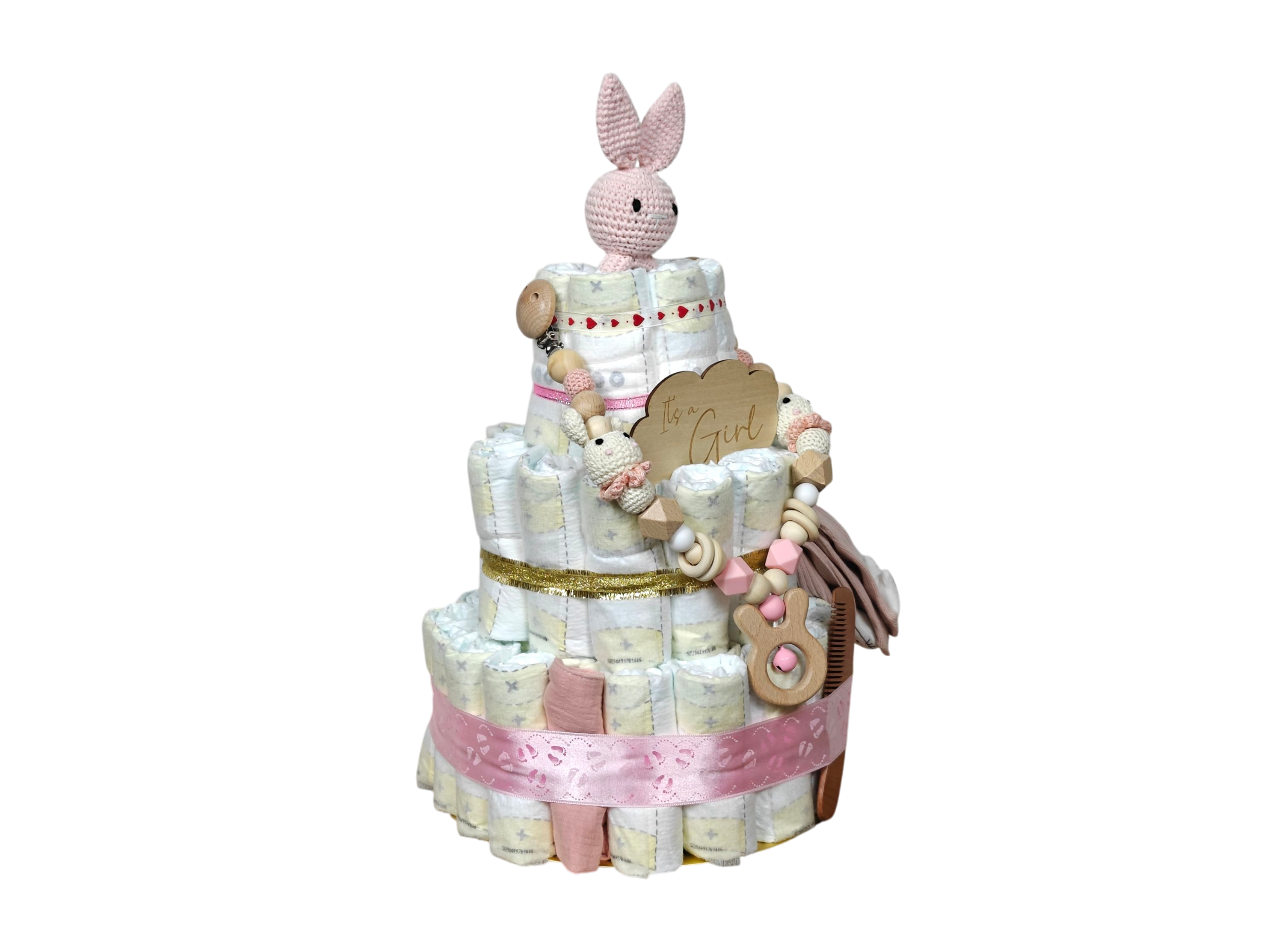 Zartrosa Träume werden wahr mit dieser liebevoll gestalteten Windeltorte. Perfekt abgestimmt auf kleine Prinzessinnen, vereint dieses Geschenk Funktionalität mit bezauberndem Design – ein Hoch auf den neuen Lebensabschnitt!