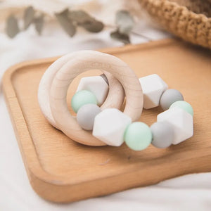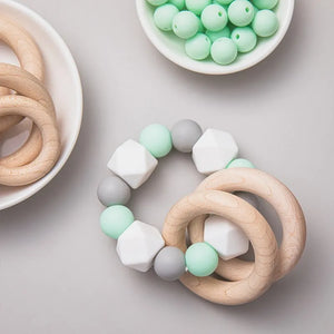 Avec le leur Perles de silicone en blanc doux, vert menthe fraîche et gris élégant ainsi que deux beaux anneaux en bois Il combine un design simple avec une fonctionnalité agréable.