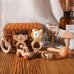 Le cadeau de naissance Xenia Baby vous emmène dans des mondes lointains et exotiques pleins de merveilles. Le majestueux hochet lion devient le roi du monde du jeu et favorise la coordination œil-main, tandis que le hochet en bois tissé à la main en bois lisse et non traité enchante les sens avec des sons mélodiques et développe la motricité fine.