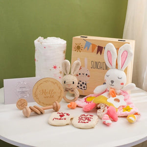 Der weiche Rasselhase wird schnell zum besten Freund, während das großzügige Multifunktionstuch durch alle Lebensphasen begleitet. Die warmen Baumwollsocken halten kleine Füße gemütlich warm und das Holzspielzeug fördert die natürliche Neugier.