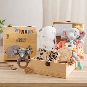 Der weiche Rasselelefant und das vielseitige Multifunktionstuch schaffen gemütliche Momente, während die Willkommens-Tafel die wichtigsten Erinnerungen festhält. Das Kuscheldreieck mit integriertem Beißring lindert Zahnungsschmerzen, die warmen Baumwollsocken schützen kleine Füße und die Holzkeule fördert spielerisch die Entwicklung.
