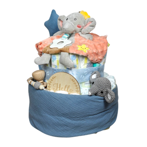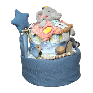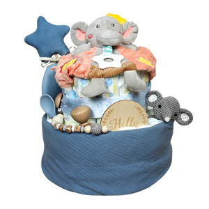 Töröö! Willkommen, kleine Elefantenfreunde! Unsere liebevoll handgefertigte Windeltorte ist ein perfektes Geschenk für frischgebackene Eltern – gefüllt mit praktischen und zauberhaften Überraschungen rund ums Baby.