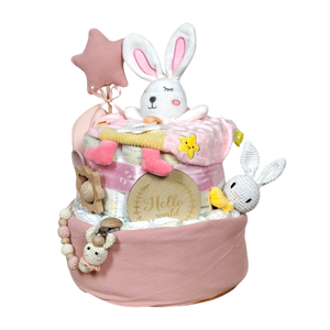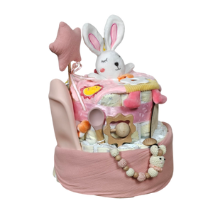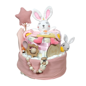 Hallo, kleine Hasenfreunde! Diese liebevoll gestaltete Windeltorte ist der perfekte Start ins Leben für deinen kleinen Schatz. Gefüllt mit durchdachten, hochwertigen Accessoires bringt sie Freude und Geborgenheit in jeden Familienalltag.