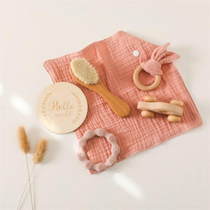 Das weiche Sabertuch aus Baumwolle meistert kleine Missgeschicke mit Leichtigkeit, die bewährte Haarbürste mit Naturborsten verwandelt die Pflege in sanfte Momente und die Willkommens-Tafel hält die ersten Lebensdaten fest. Alles sicher verpackt in einer praktischen Kartonbox.